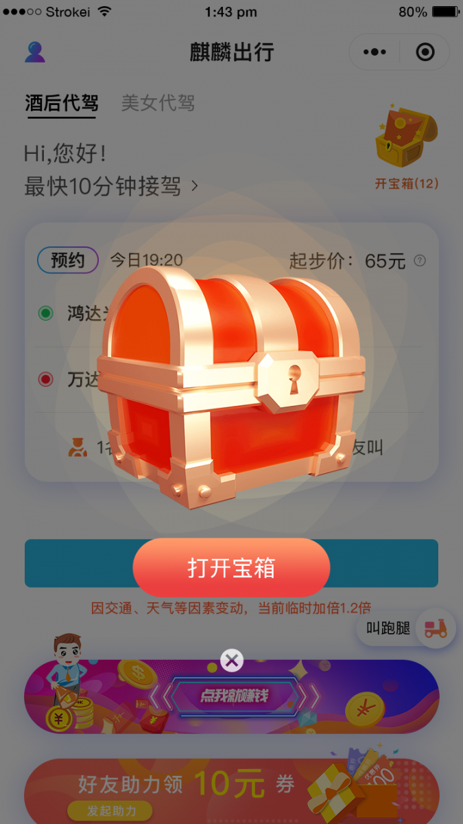 功能介绍:留存复用利好!用户在每次完成订单后,会获得一个宝箱,点击开启宝箱则有机会获得优惠券,可用于下次订单支付时抵扣现金。